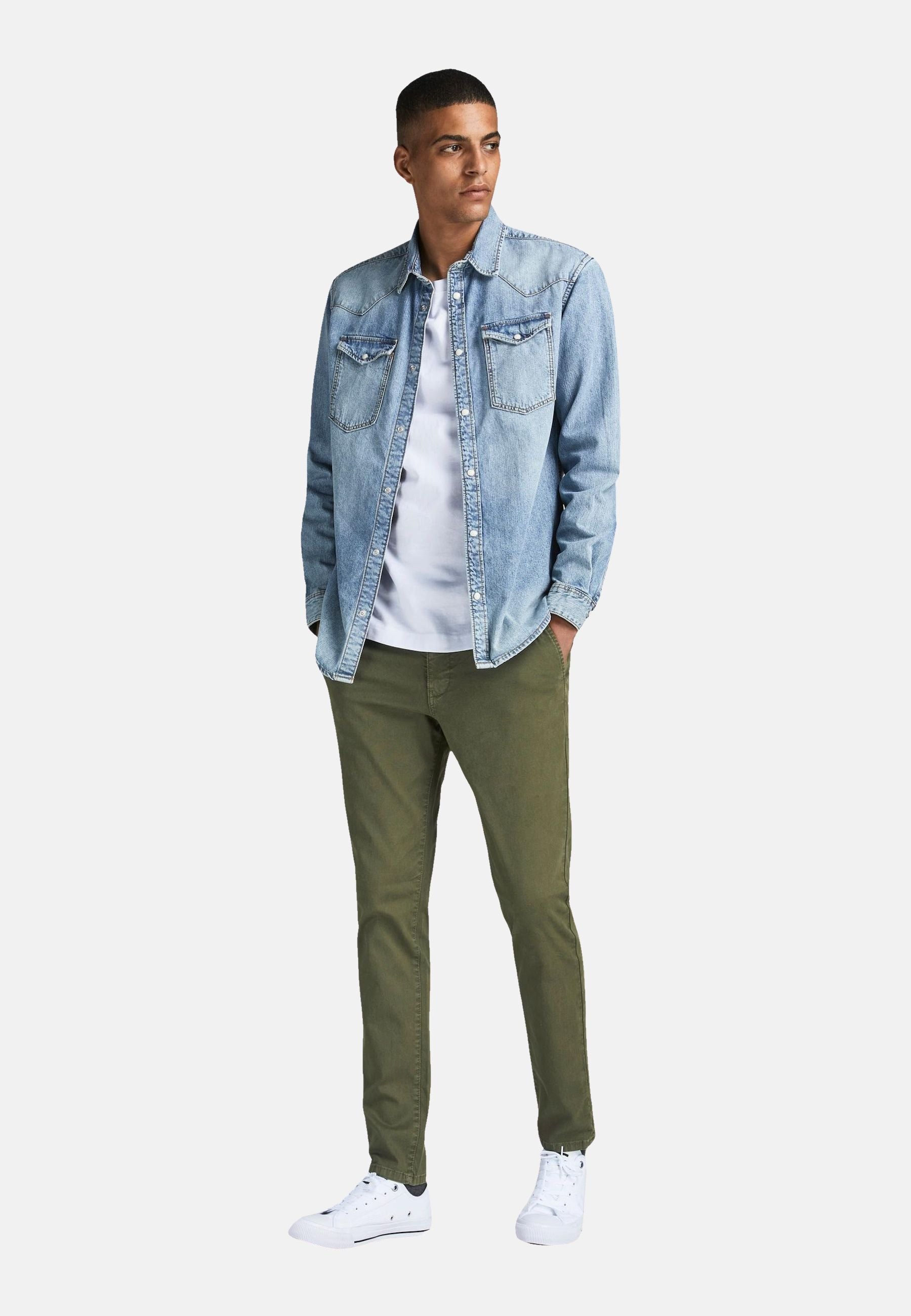Diese Chinohose von Jack & Jones ist eine elegante und bequeme Hose für Herren. Sie ist eine Mischung aus einer Anzughose und einer lässigen Five-Pocket-Hose, die zu vielen Outfits passt. Sie hat schräge Fronttaschen, Paspeltaschen mit Knopf am Gesäß und Gürtelschlaufen. Sie hat einen Reißverschluss und einen Knopf zum Schließen. Sie hat einen Slim Fit, das heißt, sie hat eine schmale Passform und einen schlanken Schnitt am Oberschenkel. Sie hat auch Tapered Legs, das heißt, sie verjüngt sich nach unten. Sie hat eine mittlere Taille und sitzt angenehm auf der Hüfte. Sie ist aus hochwertigen Materialien gefertigt, die einen Stretchanteil haben. Das sorgt für einen hohen Tragekomfort und eine optimale Passform. Diese Chinohose von Jack & Jones ist eine perfekte Hose für einen lässig-eleganten Look.